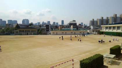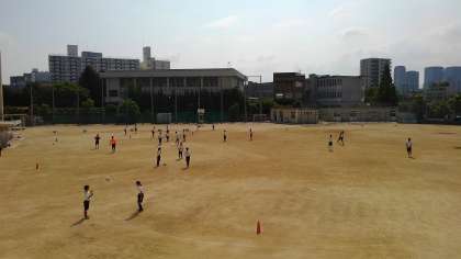 校舎北側サッカー部、体育館側女子ソフトボール部が活動中です。
