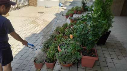花の剪定、枝も少し減らして、風通しよく、涼しく日本の夏を過ごしてもらいます。