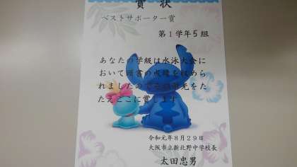 1年水泳大会のベストサポーター賞は5組です。