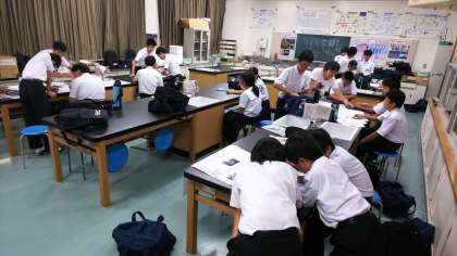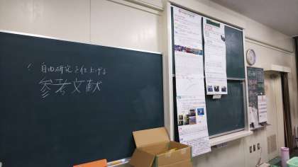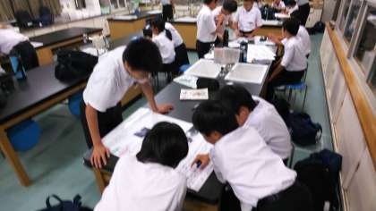 理科室では科学部が夏の間に進めてきた自由研究を、グループごとにまとめています。資料をひっくり返しながらレイアウトを考え、協力して作成中です。完成が楽しみですね。