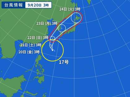 台風17号が発生。三連休にかけて日本付近を北上へ。危険半円に警戒が必要です。暴風警報発令中は部活動は中止となります。