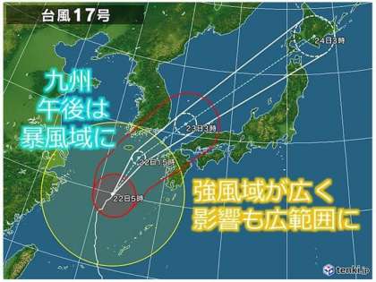 大型で強い台風17号は、暴風域を伴ったまま東シナ海を北上中です。