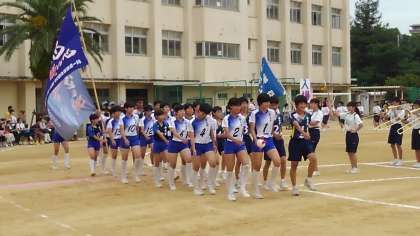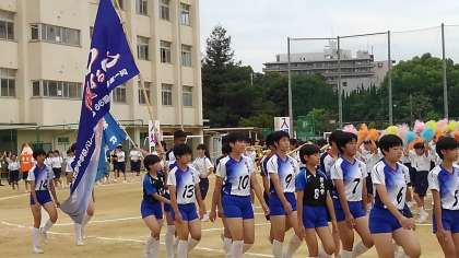 大きな部旗を掲げ入場です。