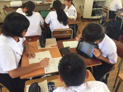 1年生の数学ではタブレットを使って授業を行なっています。班に一台なので工夫して使っています。