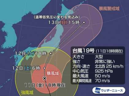 台風19号は大型で非常に強い勢力を保って日本の南を進んでいます。