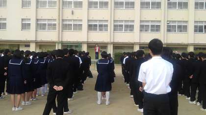 3年学年集会はグランドにて行われました。
