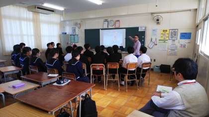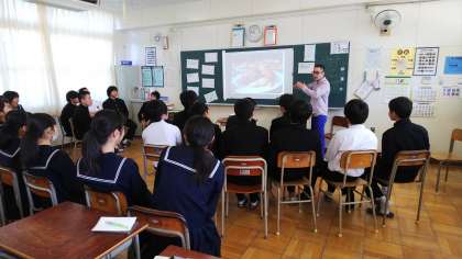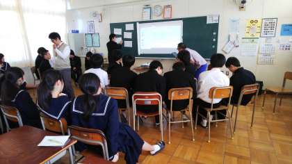 水球を現地の人に教えるなど、青年海外協力隊には様々な仕事があるそうです。質問をホワイトボードに書いて前にはり、たくさん答えていただきました。