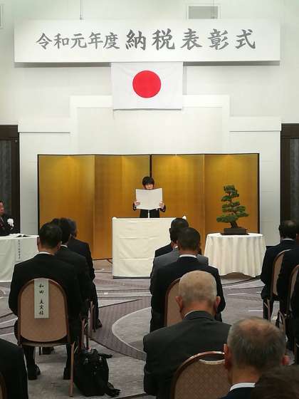 3年生の藤井貴敏君が、中学生の税に関する作文で「近畿納税貯蓄会総連合会会長賞」を受賞し、納税表彰式で朗読しました。