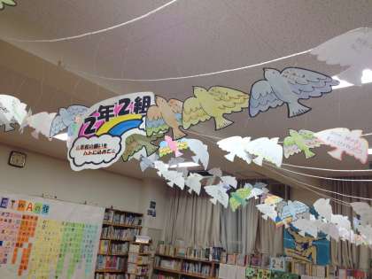 2年生は、平和の象徴(鳩)に平和への願いを込めてメッセージを書きました。たくさんの気持ちがこもっています。