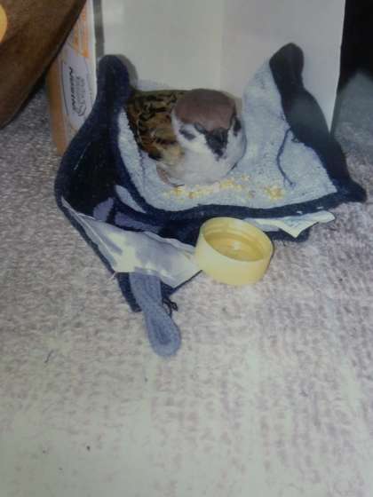 このスズメは、日曜日に傷ついて飛べなくなっているのを見つけた本校生徒が見守っていたところ、地域の方が、助けてくれたスズメです。