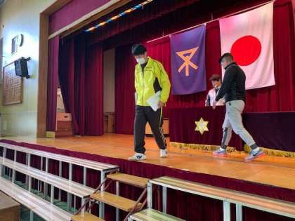 3 立礼→回れ右→正面を向いて、階段を下りる。