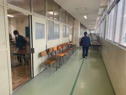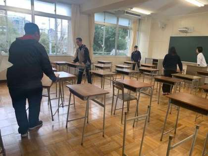 3年の職員が綺麗に清掃された教室に机、椅子を搬入してます。