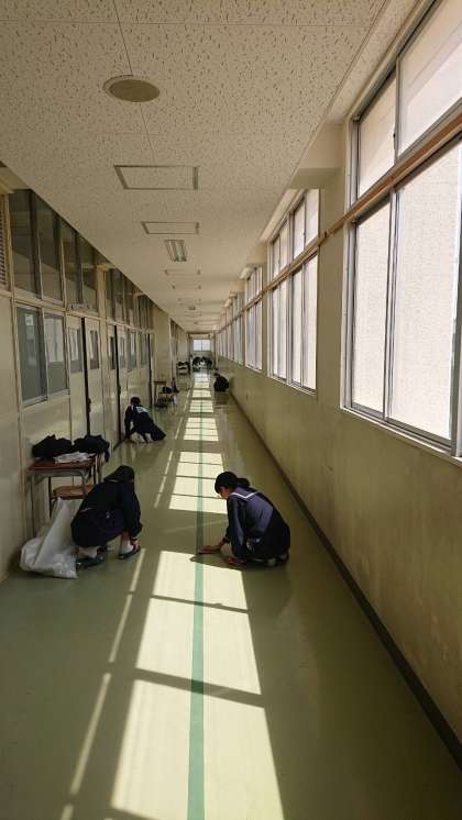 無言でバックしてくる集団…と思いきや吹奏楽部が黙々と廊下掃除をしていました。