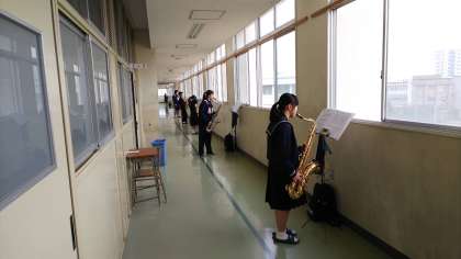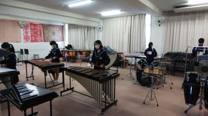 いつもはまとまって練習しているパーカッションパートも、楽器を広げて距離をとり、マスクをつけて練習しています。