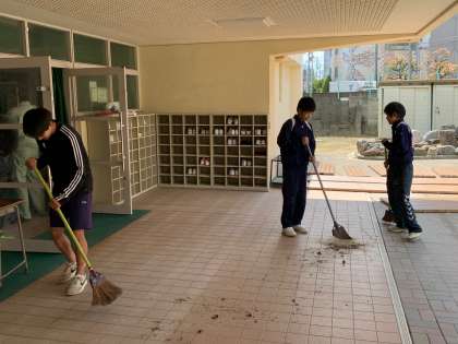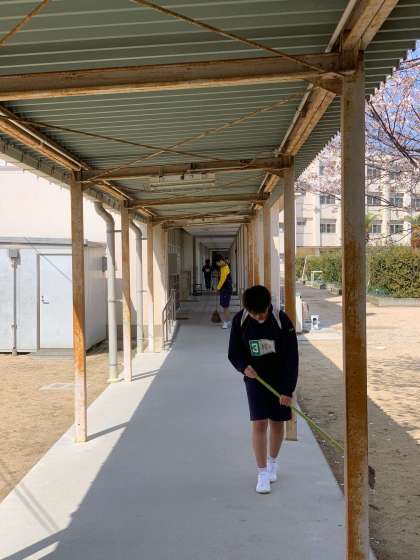 明日の入学式に向けてサッカー部が体育館前や1階の廊下、トイレの清掃をしています。
