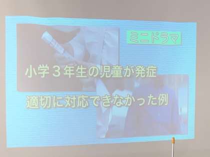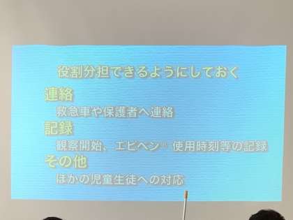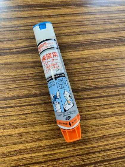 アレルギーに関する緊急対応の方法を、映像教材の視聴と練習用のエピペンを使って学びました。