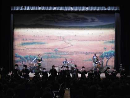 本校体育館天井工事で体育館での芸術鑑賞会ができないため、お隣の府立北野高校の多目的ホールをお借りして11月22日(土)に「芸術鑑賞会」を実施させていただきました。北野高校正門をくぐると広々としたアプローチがあり、重厚な建物に少し緊張気味な生徒の姿も見られたようです。
