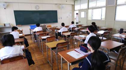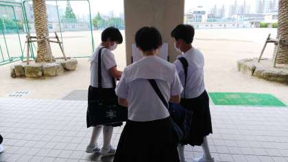 本日は校舎見学です。教室では担任の先生が職員室の入り方を説明しています。