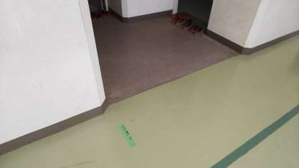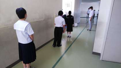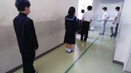 月曜日から授業が始まりますが、休み時間ごとに手を洗わなくてはいけません。密を避けるため、足元の線に合わせて距離をとって並びます。