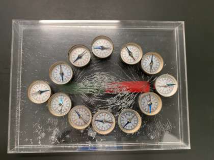 磁界と磁界の向きを説明するのに、実際に磁石と鉄粉、方位磁石を使っています。