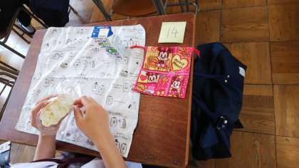 今日から簡易給食です。ランチョンマットを忘れてしまった人は必ず持ってきてください。