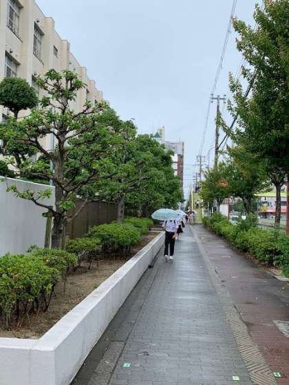 校舎側に寄って広がらないように登校しています。傘を持っている時には特に注意しましょう。