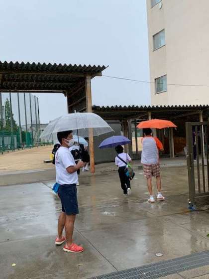 雨の中、生徒が登校しています。
