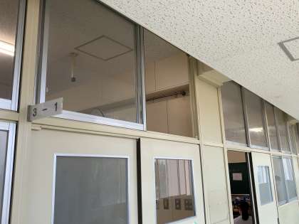 教室ではエアコンを使用していますが、換気のために窓や扉を開けています。