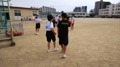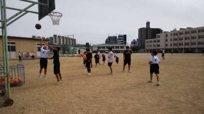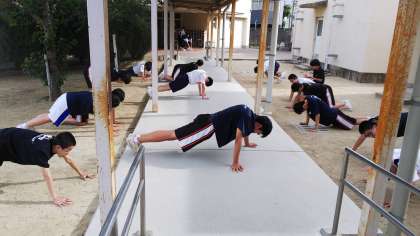 先輩が1年生にシュートを教えています。別の場所では筋トレをしているグループもいました。かなりしんどそうです。