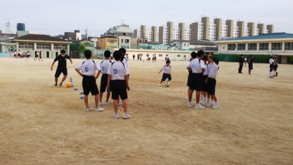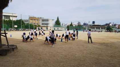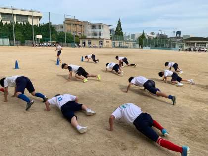 サッカー部の体験入部では身体作りから行なっています。マーカードリブルレースでは人数合わせで顧問も入って競争です。
