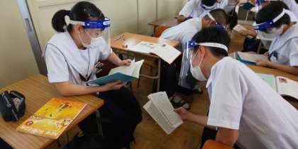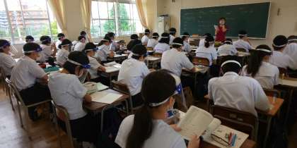 2年6組の英語の授業でフェイスシールドを使っていました。