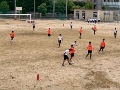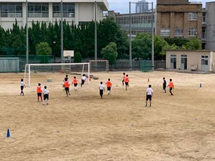 サッカー部はゲーム形式の練習をしています。プレーに制限をつけることで、考えながらプレーするようになりますね。