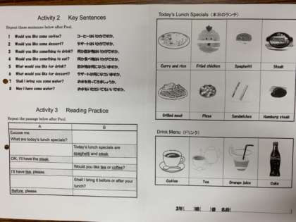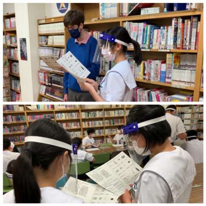 英語の授業はC-NETのポール先生との授業です。会話でペアワークをするときはフェイスシールドを使います。