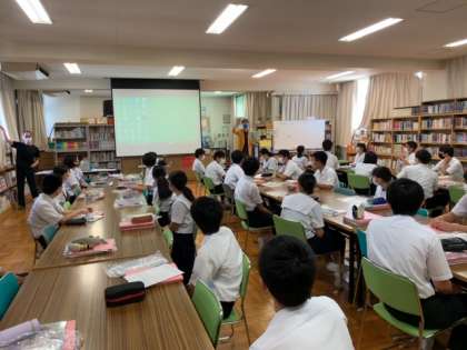ポール先生の最初の授業です。自己紹介の後、簡単な問題に答えてから、自分たちでポール先生への質問を考えます。