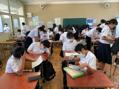 3年生は5限英語、6限社会の課題テストがあります。昼休みも勉強している生徒が多いですね。