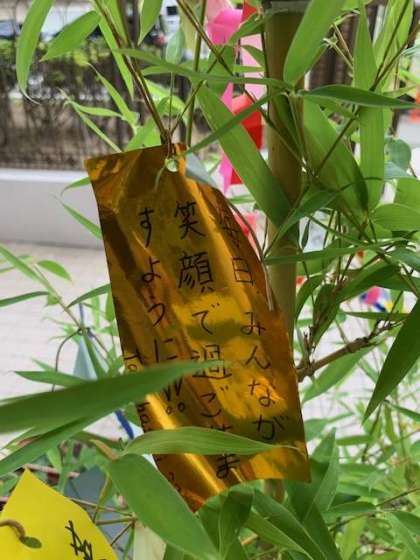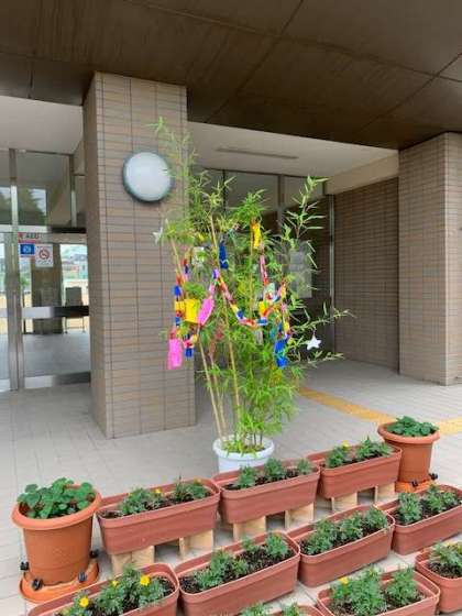 昨日、ボランティア部が正面玄関の笹に七夕の飾り付けをしてくれました。