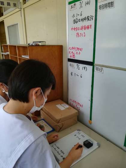 委員長が、クラスへの連絡を確認するために職員室前に来ています。