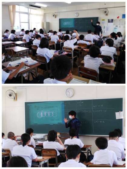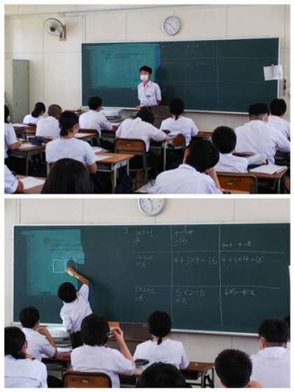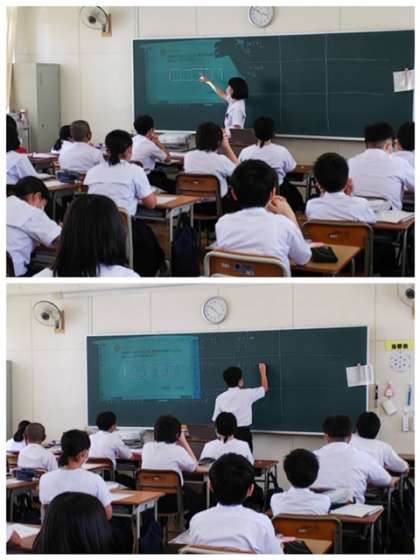 班で話し合いをした後に、代表者が発表しました。黒板の図を使い、様々な方法で棒の数を求めました。
