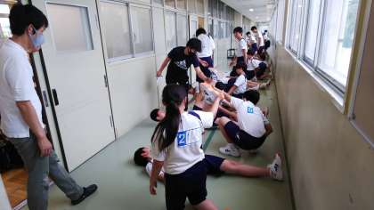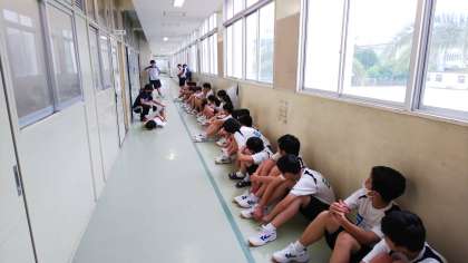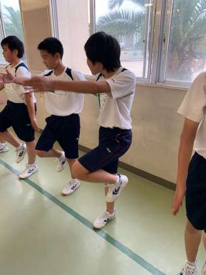 サッカー部は廊下でトレーニングをしています。橋野コーチに指導してもらいながら、自分の身体の可動域が小さいところを確認したり、神経系を鍛えるトレーニングを行いました。