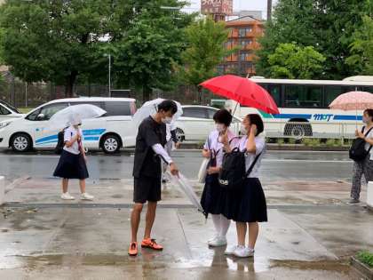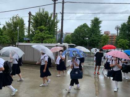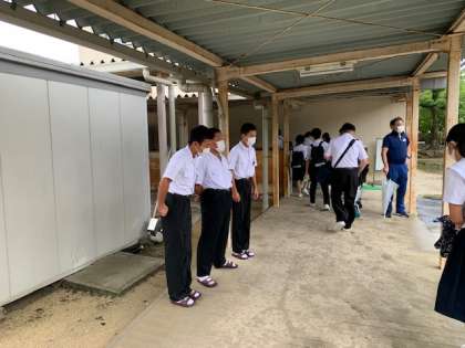 野球部が通用門で挨拶活動をしています。また、朝から体育委員が体育の先生に授業の確認をしています。
