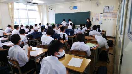 班長や委員長が前に立って進行しています。5組では1分間スピーチが行われていました。