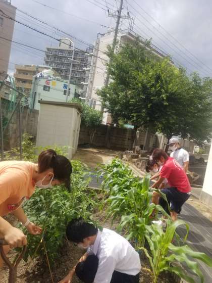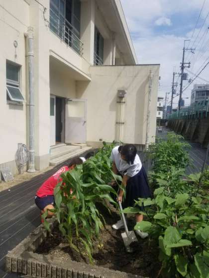 農園の修復作業中です。長く降った雨で土が流されました。写真もボランティア部生徒が撮ってくれました。