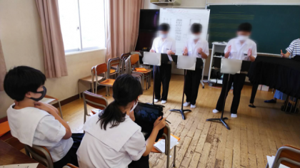 打楽器のための小品という曲で、五つのパートがあります。パートごとに動画を撮影し、提出しています。二学期にはそれぞれのパートから一名ずつが集まり、アンサンブルとして仕上げていきます。