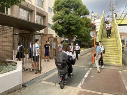 登校時、学校前の道は人の行き来が大変多いです。