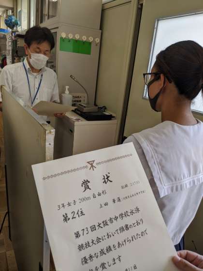 陸上部、水泳部、バレーボール部の表彰と図書委員会からの連絡です。