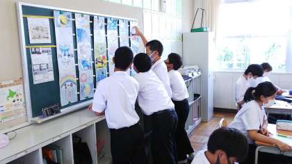 6時間目学活では、体育大会で使う学級旗のデザインを決めました。たくさんの力作の中から、それぞれのクラスらしい作品が選ばれていました。