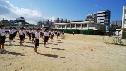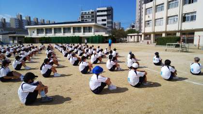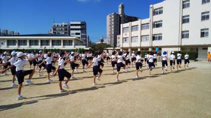 座席の確認と開会式、ラジオ体操の練習をしました。日差しが強く、時々影がさすくらいの暑いグラウンドですが、休憩時間には先生と200m競争をしている生徒もいました。元気で良いですね。