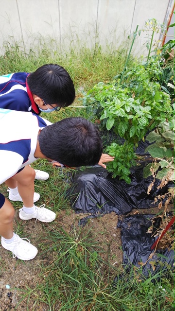 休日の畑当番が、畑を見にやって来ました。前日に雨が降ったので水やりの必要はなさそうです。以前は小さかったバジルがこんなに大きくなりました、と楽しそうに紹介してくれました。