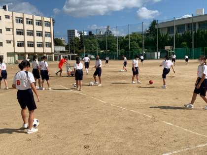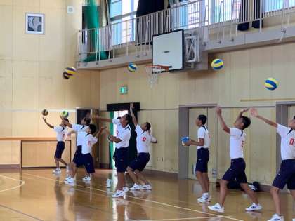 1組、2組の体育は男子が体育館でバレーボール、女子がグランドでサッカーをしています。