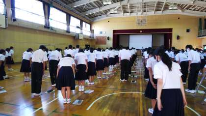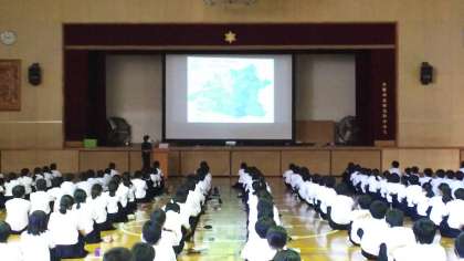 五時間目に1年生は体育館で、明日の防災スクールの事前授業を行いました。過去の災害や、今後予想される災害について、映像を交えて説明していただきました。